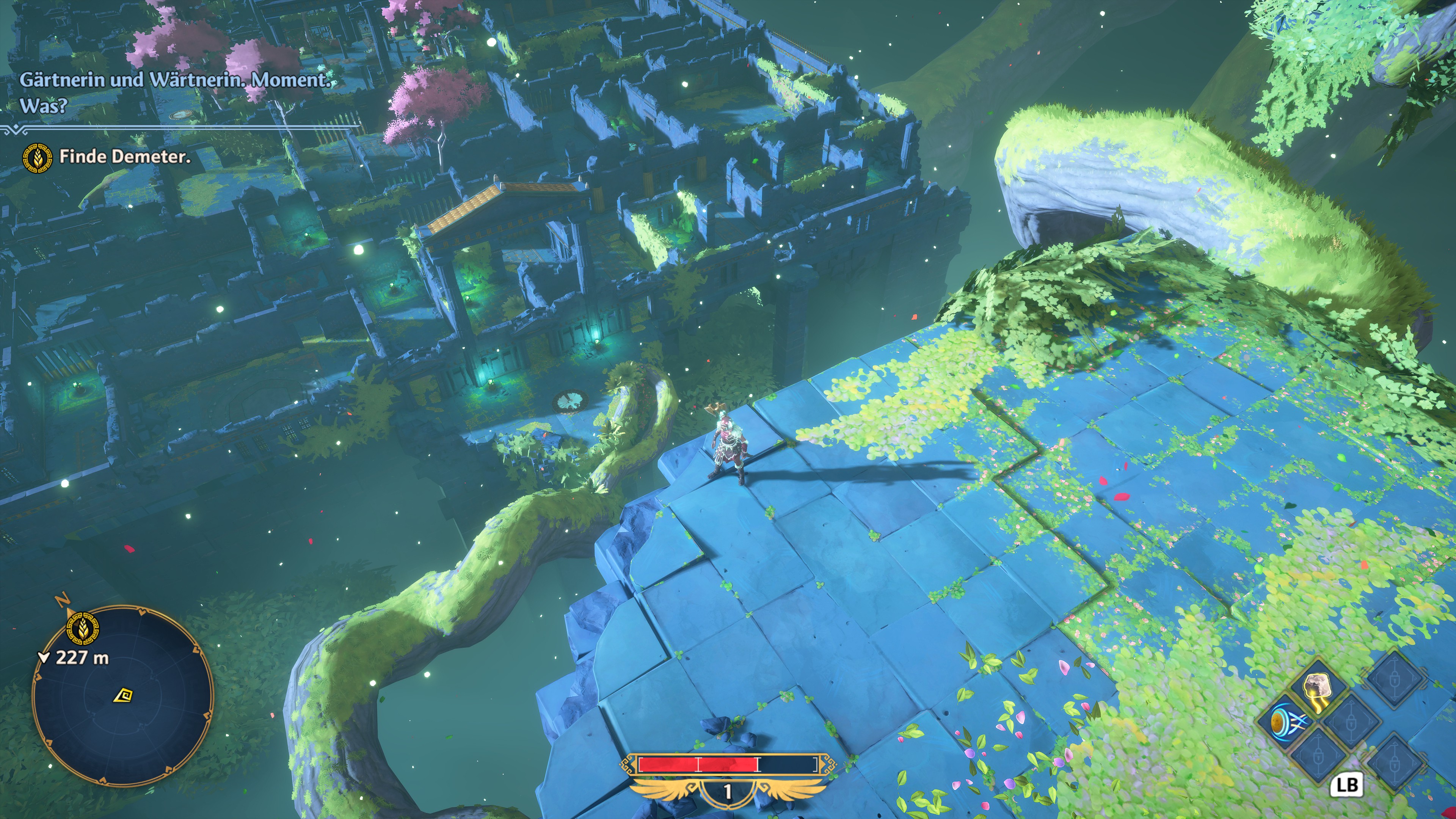 Wer wie ich schon das das reguläre Spiel mit einer weiblichen Fenyx bestritten hat, dem dürfte der Werdegang der neuen Heldin Ash allzu bekannt vorkommen – mit ihrer mutigen, offenen Persönlichkeit ähnelt sie sehr deren Heldentypus. Das ist ein wenig schade, weil sich das neue Abenteuer damit etwas anfühlt, als habe Ubisoft Quebec schlicht sein erstbestes Erfolgsmodell kopieren wollen. Zum Glück wird nach den trägen Gesprächen von „Mythen aus dem Reich des Ostens“ wieder das Dialogniveau des Grundspiels erreicht – die Gottheiten agieren zotig bis selbstverliebt, es gibt Albernheiten und dümmliche Wortspiele. In der neuen, recht großen Spielwelt muss Ash allerhand Aufträge für Götter und Göttinnen übernehmen, die sonst oft in der zweiten Reihe stehen – z.B. Demeter oder Hestia. Anders als im Hauptspiel oder dem zweiten DLC gibt es in der prinzipiell offenen Spielwelt natürliche Grenzen wie z.B. Abgründe, die erst überwunden werden können, wenn man eine bestimmte Mission absolviert hat. Hier hat sich Ubisoft eher am klassischen Zelda-Prinzip orientiert statt auf dessen Open-World-Novellierung aus