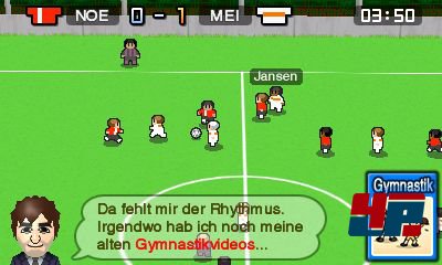 Dabei fallen vor allem drei Dinge auf. Erstens: Die Mannschaft ist in einem erbarmenswerten Zustand. Bälle verspringen. Der Torwart schafft es mit seinem Abschlag aus der Hand nicht einmal in die Nähe der Mittellinie. Die Verteidiger grätschen hoffnungslos an ihren Gegnern vorbei. Die Flügelstürmer sind langsamer als meine Oma. Doch wenn alles in Ordnung wäre, bräuchte das Team sicherlich keinen neuen Trainer. Zweitens: Die Matchdarstellung ist (mit zwei zugedrückten Augen) gewöhnungsbedürftig. Die 2D-Sprites bewegen sich mit nur wenigen Animationen über ein Pseudo-3D-Spielfeld. Dennoch entfacht das Zusehen einen liebenswerten Charme – Erinnerungen an den Klassiker Sensible Soccer werden wach. Drittens: Meinem Mii fallen ständig irgendwelche taktischen, spielerischen oder mentalen Mängel auf, für deren Behebung im Training eine Karte bereit gestellt wird. Das kann z.B. Sprinten sein. Oder Pressing. Oder Kopfbälle. Insgesamt gibt es gut 50 Karten in vier Kategorien (taktisch, körperlich, technisch, diverse).