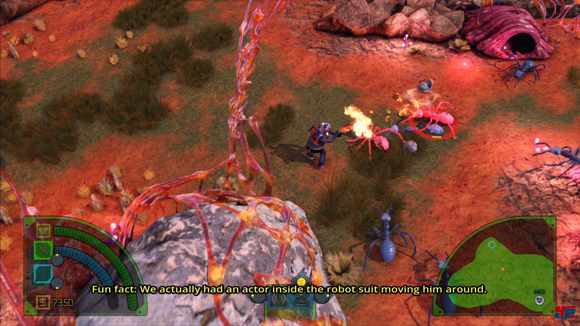 Das Spielkonzept wirkt auf den ersten Blick gar nicht so ungewöhnlich: Dick Starspeed, sein getreuer Roboter-Sidekick mit dem kreativen Namen „Robot“ und die außerirdische Scarlet Nova prügeln und ballern sich mit allerlei lustig designten Energiewaffen an die Spitze eines gigantischen Turms. Die Geschichte passt im Prinzip auf einen Bierdeckel, das Ace Team hat aber einen coolen Kniff angewandt, um das B-Movie-Thema trotzdem auch erzählerisch unterhaltsam zu präsentieren. Kurz vorm Re-Release des fiktiven Trash-Klassikers wurde Regisseur Dan Smith für eine Audiokommentar ins Studio geladen, der in seinem Redefluss kaum zu bremsen ist. Zu jedem noch so profanen Detail hat er eine Geschichte parat. Mal sind die aufmüpfigen Komparsen Thema, die über die Nacht in Affenkostümen in ihren Käfigen vergessen wurden - später erläutert Smith, wie er die Welpen des Aufnahmeleiters in Staubsaugerbeutel zwängte und so in Rekordzeit neue Monster parat hatte. Dass der Darsteller im Roboter-Kostüm nicht im Abspann zu lesen ist, versteht sich von selbst – er stand schließlich nicht mal auf der Gehaltsliste! Kurz gesagt ist der Regisseur also ein echter Sympathieträger, der derart unbefangen vor sich hinplaudert, dass sein stetiger Audiokommentar zum unterhaltsamsten Spielelement avanciert. Sogar zeitgemäße Seitenhiebe auf Assassin's Creed oder progressive Gender-Debatten hat er auf Lager.