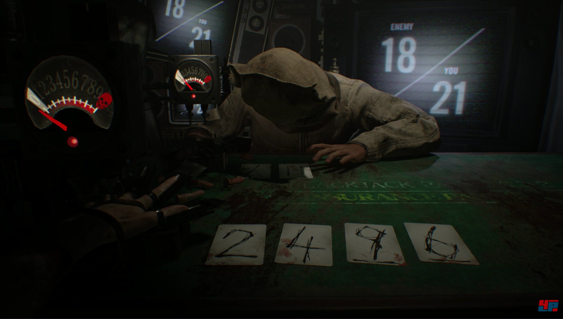 Die Atmosphäre, die bei diesem morbiden Kartenspiel vor allem hinter der VR-Brille entsteht, ist bedrückend – teilweise sogar im positiven Sinne unangenehm. Vor allem, wenn die Bestrafungen für den Verlierer erfolgen, leidet man wie bei den frühen Saw-Filmen mit und schaut vielleicht sogar das eine oder andere Mal weg. Allerdings gibt es auch ein paar unpassende Momente. Wenn Clancy gerade eben noch einen (oder mehrere) Finger verliert, vor Schmerzen schreit und wimmert, aber kurz darauf mit trockener Stimme sagt, dass er eine weitere Karte möchte, verliert das Duell an Intensität. Hat man seinen Gegner mit allen zur Verfügung stehenden Mitteln ausgeschaltet, warten übrigens zwei Survival-Modi, in denen man so viele Gegner wie möglich besiegen muss, bevor einem die Finger ausgehen. Dennoch: Abgesehen von einer leichten Vertiefung bestimmter Wesenszüge von Lucas, die einem aber auch schon im Hauptspiel klar werden, hat auch 21 nichts mit der Kampagne zu tun.