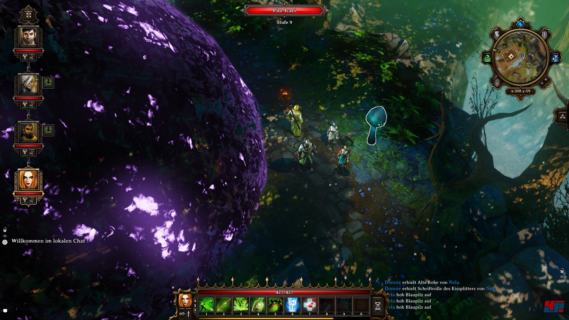 Geht ihr vom ersten Wegpunkt-Portal oder der Lagerstelle, wo ihr eure Eskorte begonnen habt, in Richtung Osten, trefft ihr auf einen Beschwörer, den ihr mit Überredungskunst oder einem Kampf gegen vier magieanfällige Schattenwandler überwinden könnt. Danach stoßt ihr auf ein weiteres Wegpunkt-Portal mit einer Schatzkiste sowie eine magische Barriere, neben der zwei sprechende Pilze stehen. Quatscht einen von ihnen an und beantwortet seine Fragen mit "Kornähre", "Stein" und "Schmetterling". Anschließend könnt ihr die Barriere mit dem zuvor erbeuteten Zauberpergament entfernen. Alternativ könnt ihr die beiden Pilze auch mit Waffengewalt töten, was die Barriere ebenfalls verschwinden lässt. Betretet anschließend die Hütte und benutzt das Spiegelportal, um in die Grotte der Hexe zu gelangen.